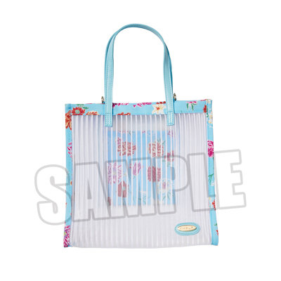 透け感のある素材が、夏にピッタリ。内ポケットの花柄が透けて見えるのがポイント。マスコットやショルダーストラップを付けられる金具付き。多種多様な用途に使えるバッグです。